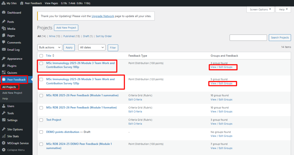 - For PG MedLearn, go to: https://pg-medlearn.imperial.ac.uk/peer-feedback/wp-admin/edit.php?post_type=peer_projects. For UG MedLearn access please liaise with your MedLearn admin to get access.