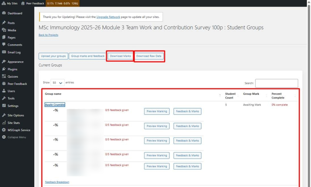 - Click on View / Edit Groups. You will be able to see each group’s progress and download marks and raw data there.